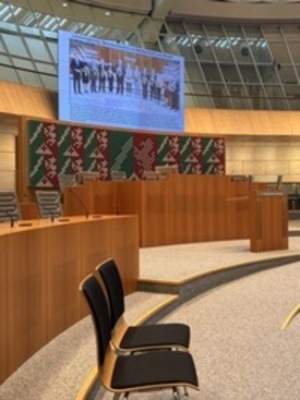 Im anschließenden Gespräch mit dem Abgeordneten Arndt Klocke (Bündnis 90/Die Grünen für den Wahlkreis Ehrenfeld-Nippes), seinem Büroleiter Jonas Moore und der Social-Media-Referentin Camila Agudelo ging es in einen der kleineren Ausschusssäle – auch dieser gestaltet wie ein kleiner Plenarsaal.